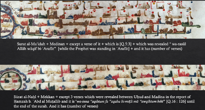 - Division textuelle : les titres de sourates fournissent des informations sur les lieux de révélation, avec parfois des informations complémentaires sur les circonstances de la révélation. Les marges indiquent non seulement les versets et groupes de cinq ou dix versets, mais aussi des divisions structurelles plus larges du Coran.