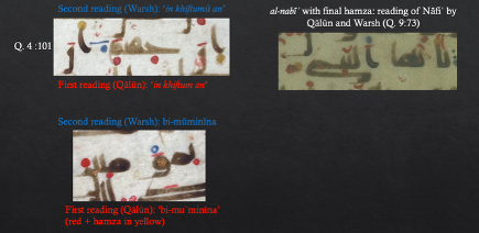 Il nous éclaire sur la lecture du Coran à la Grande Mosquée de Málaga selon la récitation de Nāfiʿ transmise à la fois par Qālūn et par Warsh. L’identité du commanditaire reste inconnu, mais le contexte de production suggère un érudit andalou éminent — peut-être al-Dānī lui-même. Quant au copiste, il restera lui-aussi inconnu… Comme le mentionnent les sources, il pourrait aussi s’agir de l’une de ces nombreuses femmes de Cordoue qui copiaient le Coran en écriture coufique à Cordoue.